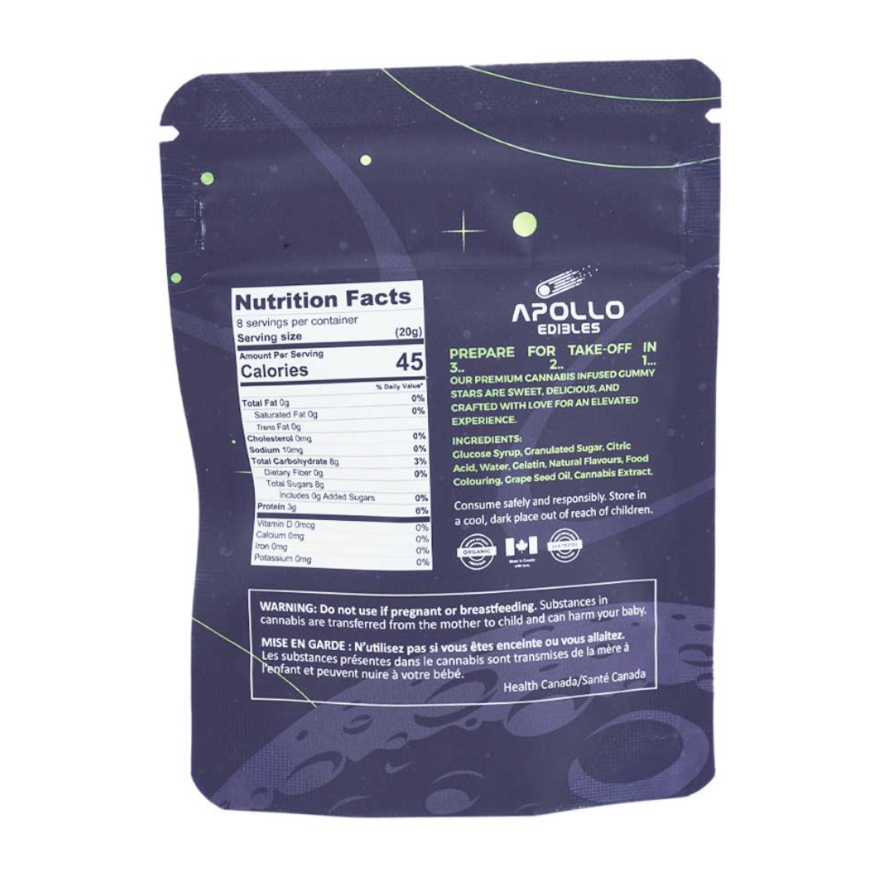 Blast off with high dosage Apollo Shooting Stars Gummies made locally in British Columbia, crafted with premium quality ingredients and top of the line THC oil. Take these Indica dominant infused gummies for and amazing euphoric experience or for those suffering with medical conditions such as chronic pain, insomnia, and anxiety.