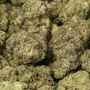 Donkey Butter is a rare indica dominant hybrid strain (70% indica/30% sativa) created through crossing the classic Grease Monkey X Triple OG strains. The name may be weird, but this bud packs a super savory pungent flavor and lifted effects that are perfect for any indica lover. Donkey Butter has a spicy skunky flavor with hints of earthy pine and herbs as you exhale. The aroma is very heavy and pungent with a spicy diesel effect that’s accented by rich skunk and rotting pine. The Donkey Butter high has a euphoric overall feel that’s perfect for evenings when you want to kick back and relax. You’ll feel a relaxing lift at the onset of the high that fills you with a light tingly energy and a sense of euphoria. Soon, this effect will fade into a deep peaceful body high that leaves you sleepy, couch-locked, and slightly aroused. Thanks to these effects and its high 29% average THC level, Donkey Butter is often chosen to treat conditions such as chronic stress, insomnia, chronic pain, migraines or headaches, and nausea. This bud has long tapered olive green nugs with thin amber hairs and a coating of super thick frosty golden crystal trichomes.