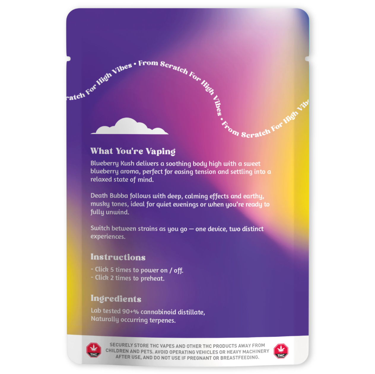Blueberry Kush is rich in sweet berry flavor and delivers a gentle, soothing body high that eases tension and melts stress. Death Bubba goes further, with earthy pine notes and a sedative effect that promotes deep rest and recovery. Together, they form a knockout combo for users who take their downtime seriously.