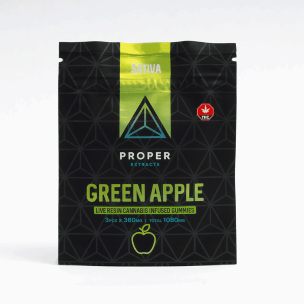 Proper Extracts Green Apple Sativa Gummies are a delicious way to elevate your cannabis experience with a perfect balance of flavor and full-spectrum effects. Each pack contains three gummies at 360mg each (1080mg total THC), crafted with premium live resin to deliver the uplifting, energetic qualities that sativa lovers crave.