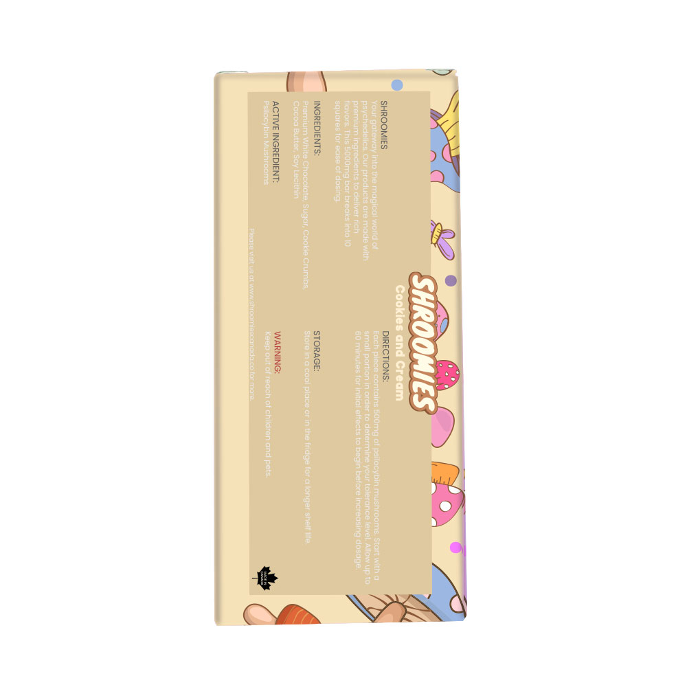Ingredients: Sugar, Cocoa Butter, Milk, Soy Lecithin, Artificial Flavour, Oreo Cookie Crumbs | Active Ingredients: Psilocybin Mushroom (Golden Teacher)